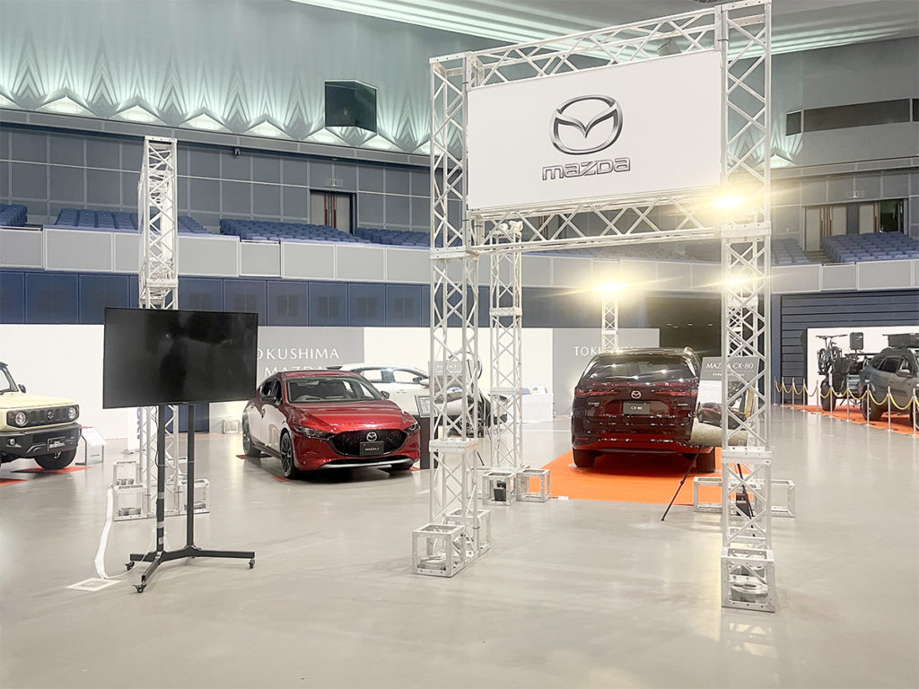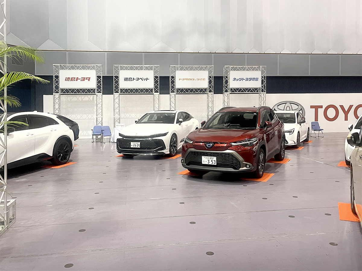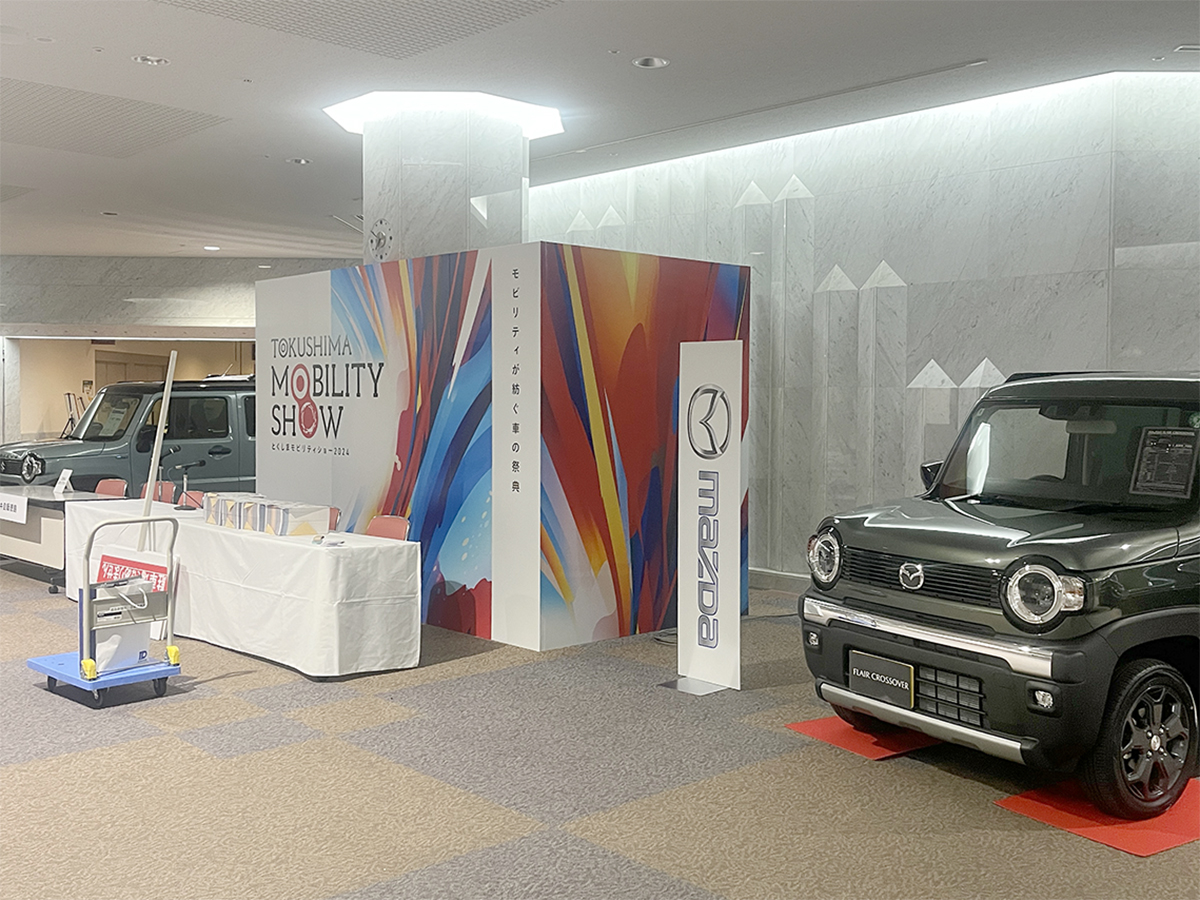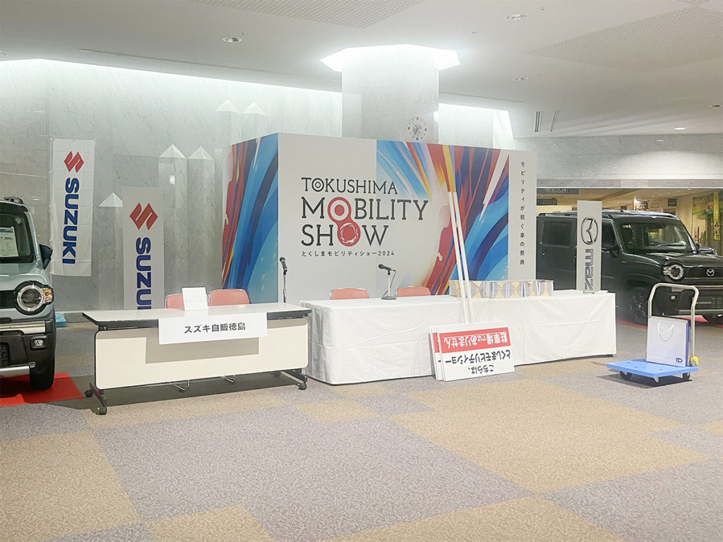 ホーム事業実績展示会・ガイダンスとくしまモビリティショー20242024年10月16日2025年12月7日主催様:日本自動車販売協会連合会徳島県支部、徳島新聞社会場:アスティとくしま撮影:多目的ホール、エントランス周辺、多目的駐車場 作業内容各ディーラー様の看板製作、グラフィックバックパネルの施工会場内の車輌展示スペースの区割り、図面作成各ブースに係る仮設電気工事の手配多目的駐車場(屋外イベントスペース)のテント業者手配
