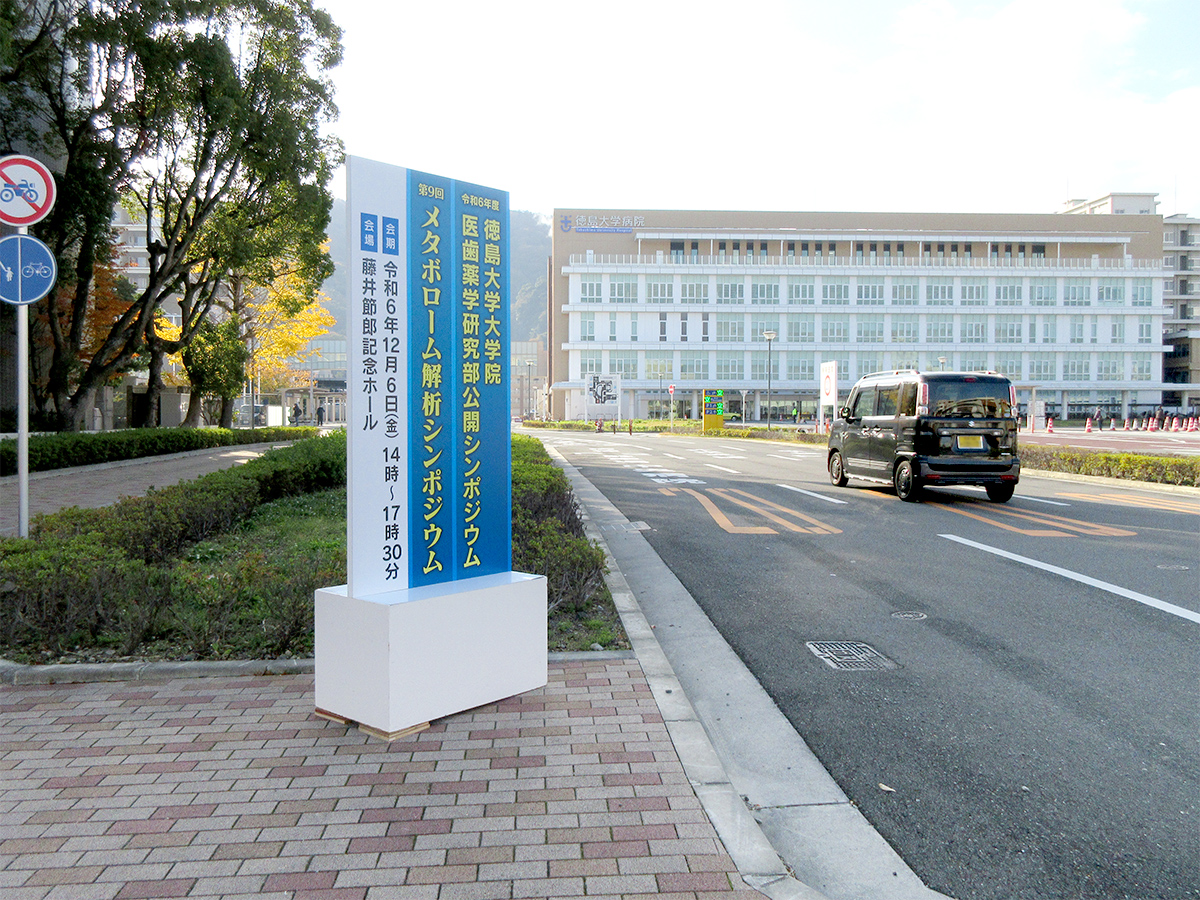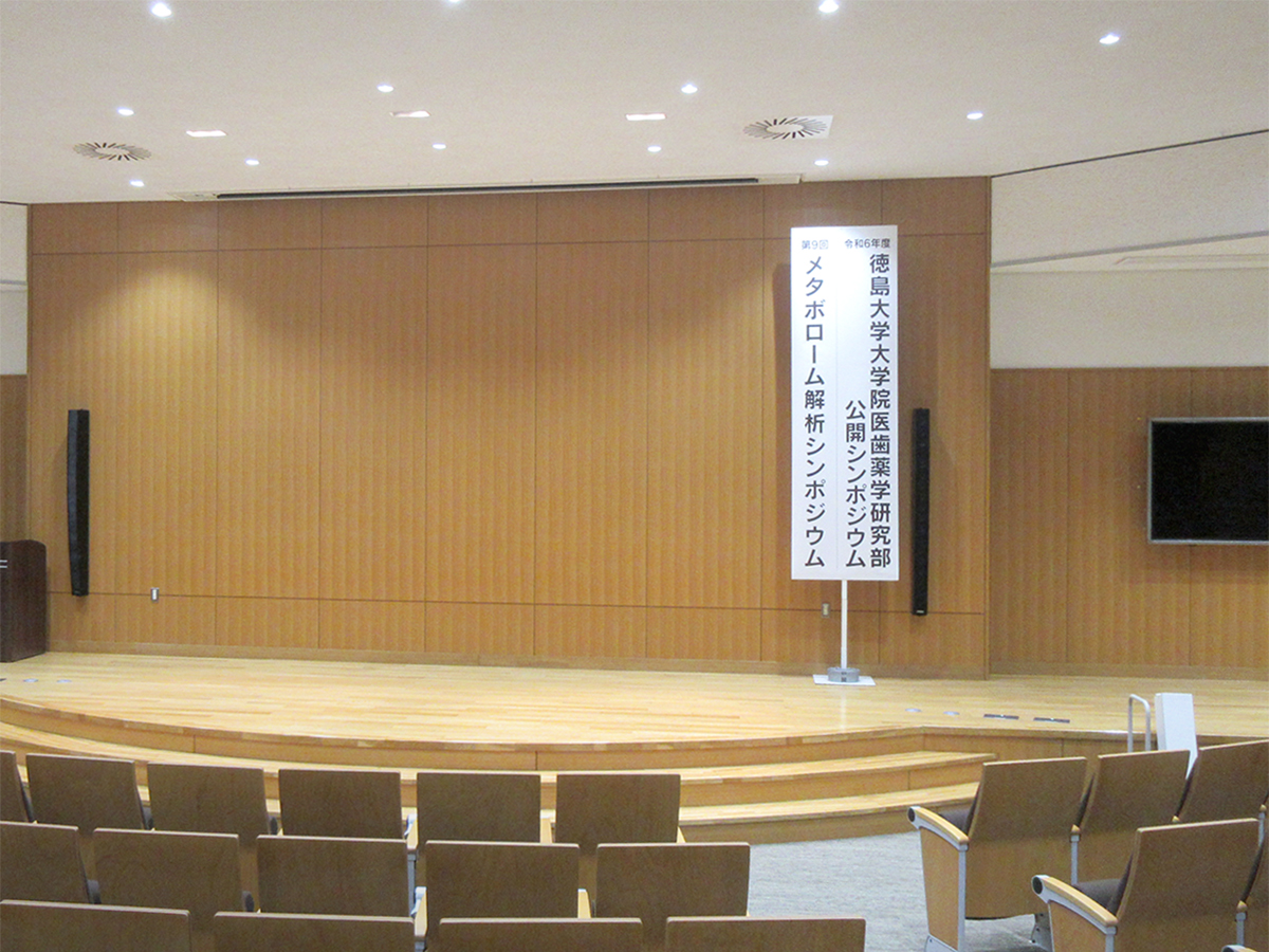 ホーム事業実績学会・研修会 令和6年度徳島大学大学院 医歯薬学研究部公開シンポジウム・第9回メタボローム解析シンポジウム 2024年12月9日2025年12月18日 主催様:令和6年度徳島大学大学院医歯薬学研究部公開シンポジウム会場:徳島大学 藤井節郎記念医科学センター1F ホール内撮影:会場玄関前の看板・ホール内の講演垂幕など 作業内容 藤井節郎記念ホールのステージ上に講演垂幕(自立型)を設置 蔵本キャンパス内にイベント看板を設置
